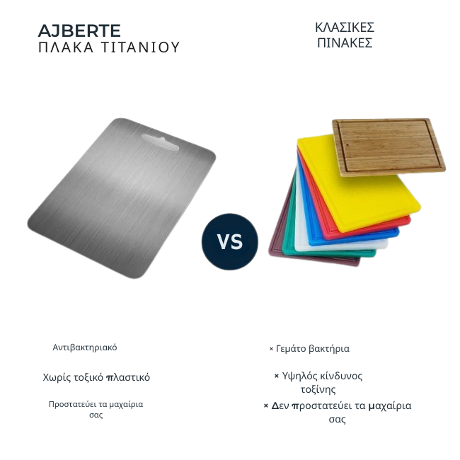 Οι παραδοσιακές σανίδες έχουν τη θέση τους, αλλά το AJBERTE® προσφέρει ανώτερη υγιεινή και ανθεκτικότητα. Σε αντίθεση με το ξύλο και το πλαστικό, το AJBERTE® είναι πολύ ανθεκτικό στα βακτήρια και δεν περιέχει επιβλαβή χημικά. Είναι επομένως μια πιο ασφαλής και φιλική προς τα μαχαίρια επιλογή, που εγγυάται μια πιο καθαρή και αποτελεσματική μαγειρική εμπειρία.